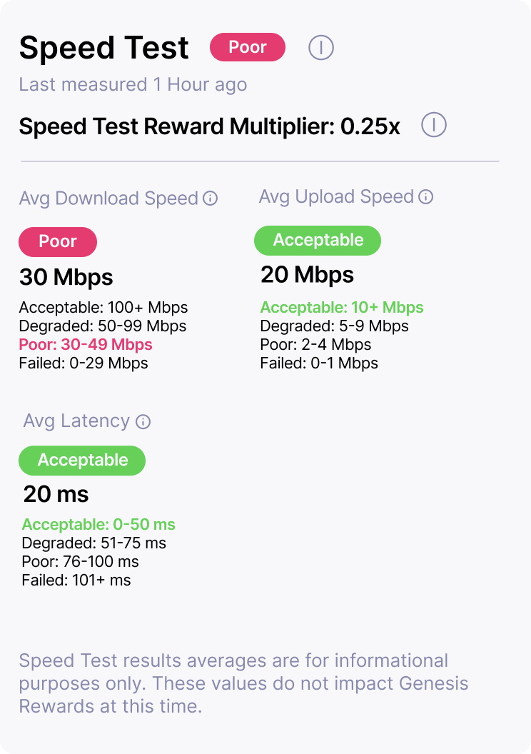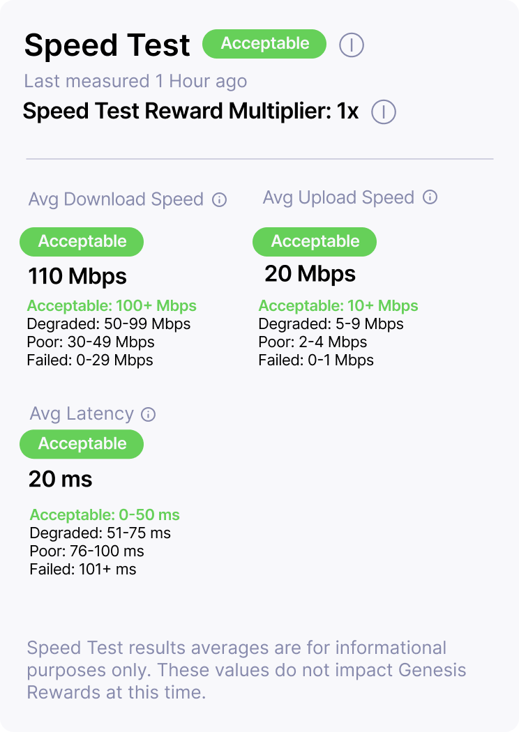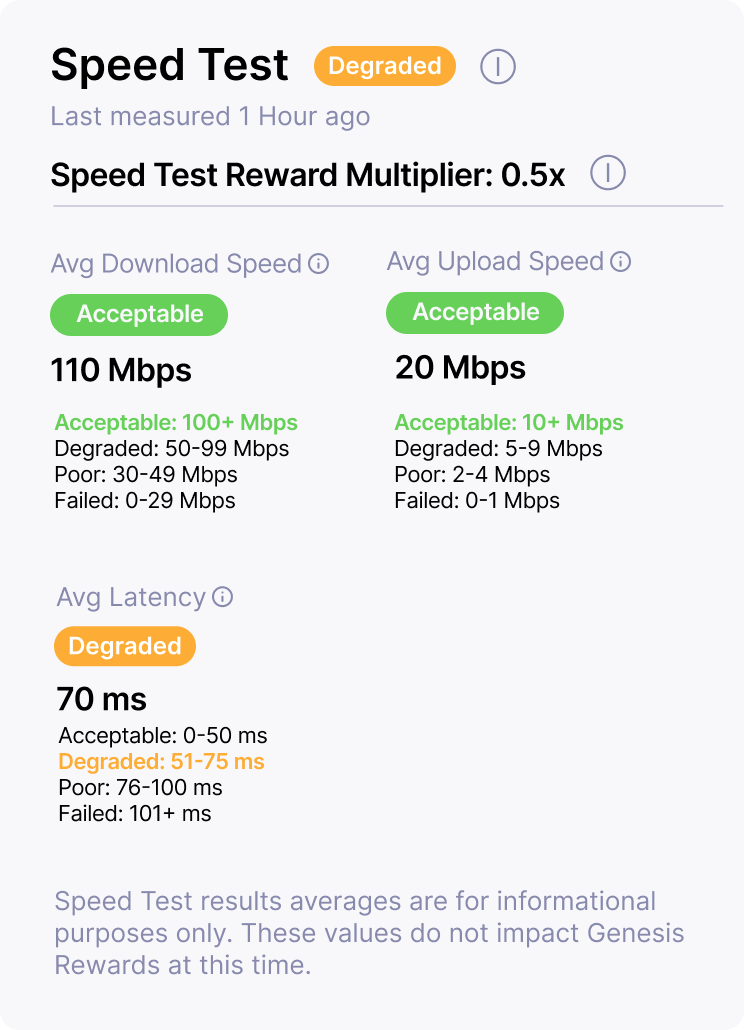 This 5G Hotspot will be eligible for half rewards during the Reward Periods for which the results of Tests 6 through 8 are the most recent as at least one Speed Test metric Moving Average has not met or exceeded the required values.