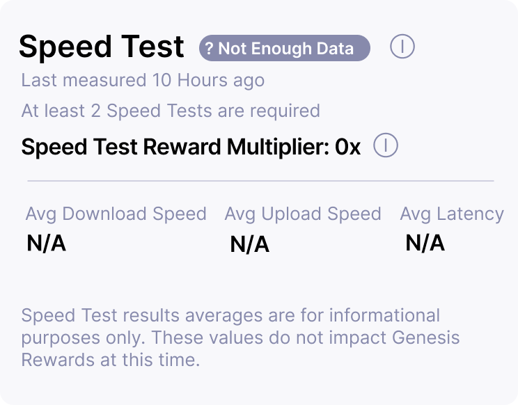 This status appears when a Speed Test could not be performed in the previous 24 hours. For example, when a 5G Hotspot has recently recovered from a prolonged network interruption, power interruption, or other connection interruptions have occurred.