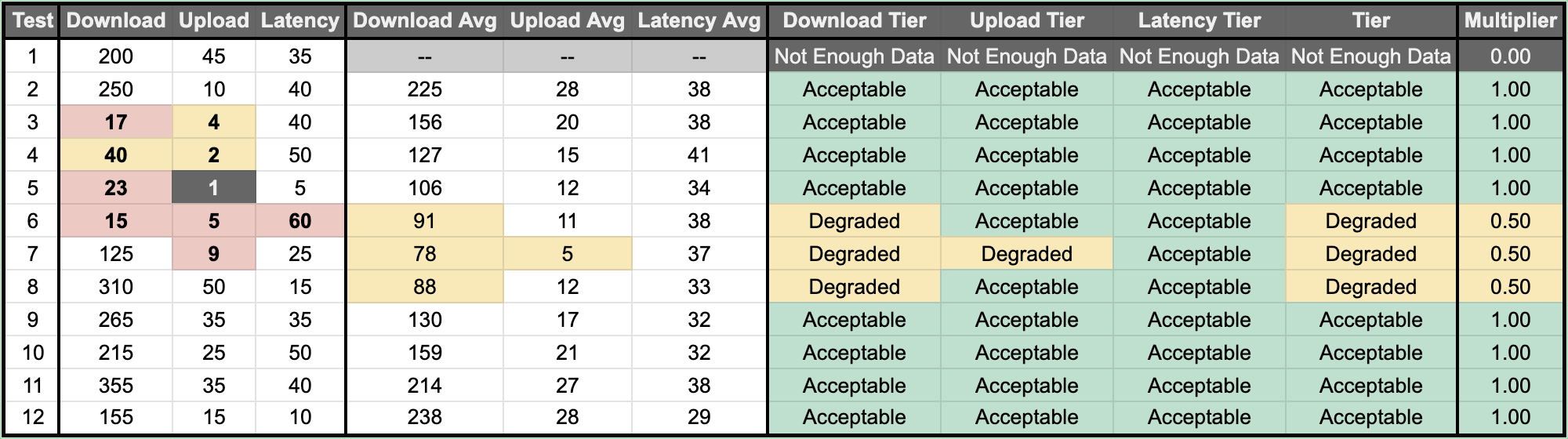 | Degraded | 0.50x | 50+ Download, AND 5+ Upload, AND <75 Latency |