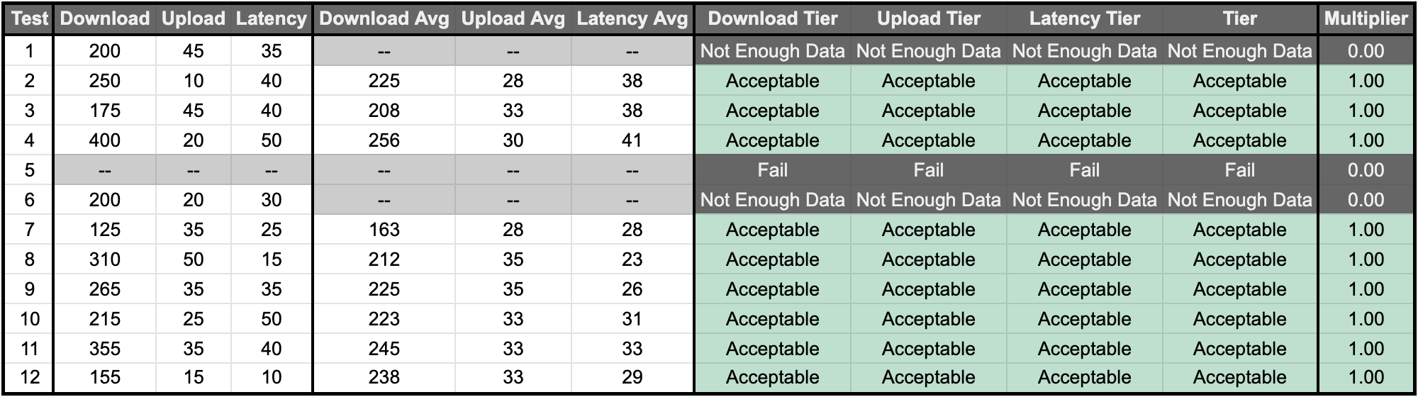 | Fail | 0.00x | <30 Download, OR <2 Upload, OR >100 Latency |