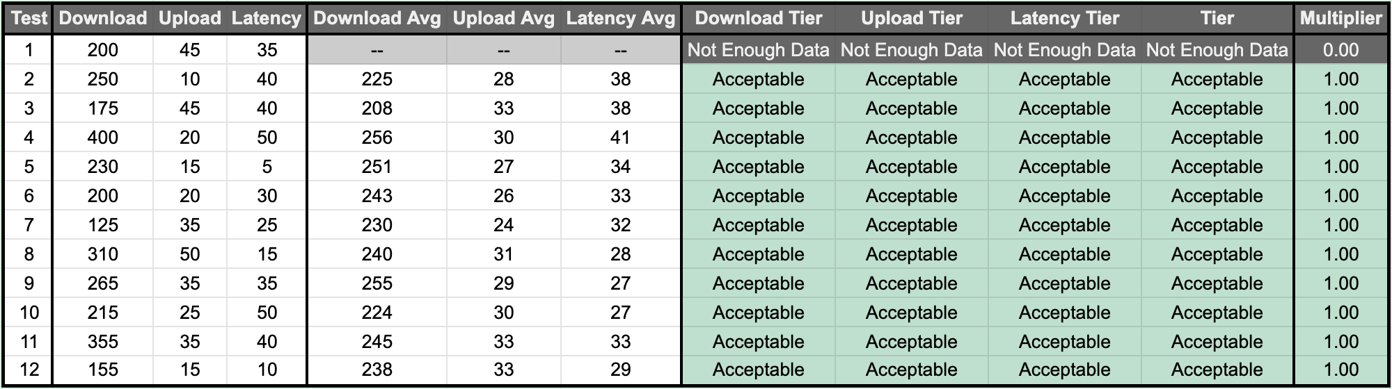 | Good | 1.00x | 100+ Download, AND 10+ Upload, AND <50 Latency |