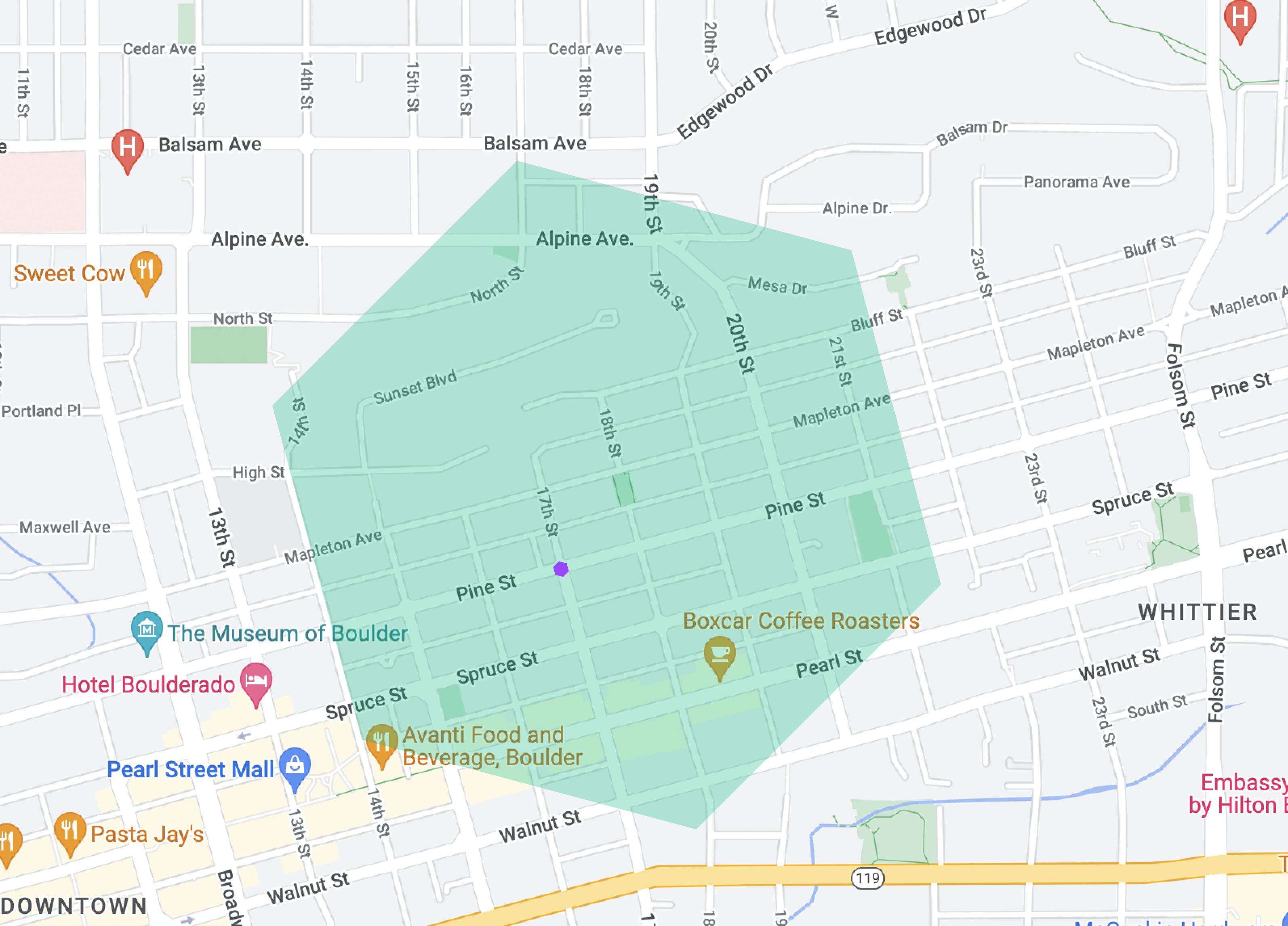 To help visualize the significant difference between these two resolutions, below is a map with a green res8 hex and a purple res12 hex inside.