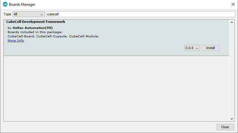 The Heltec CubeCell Board requires one Arduino board support package. Follow the instructions below to install.