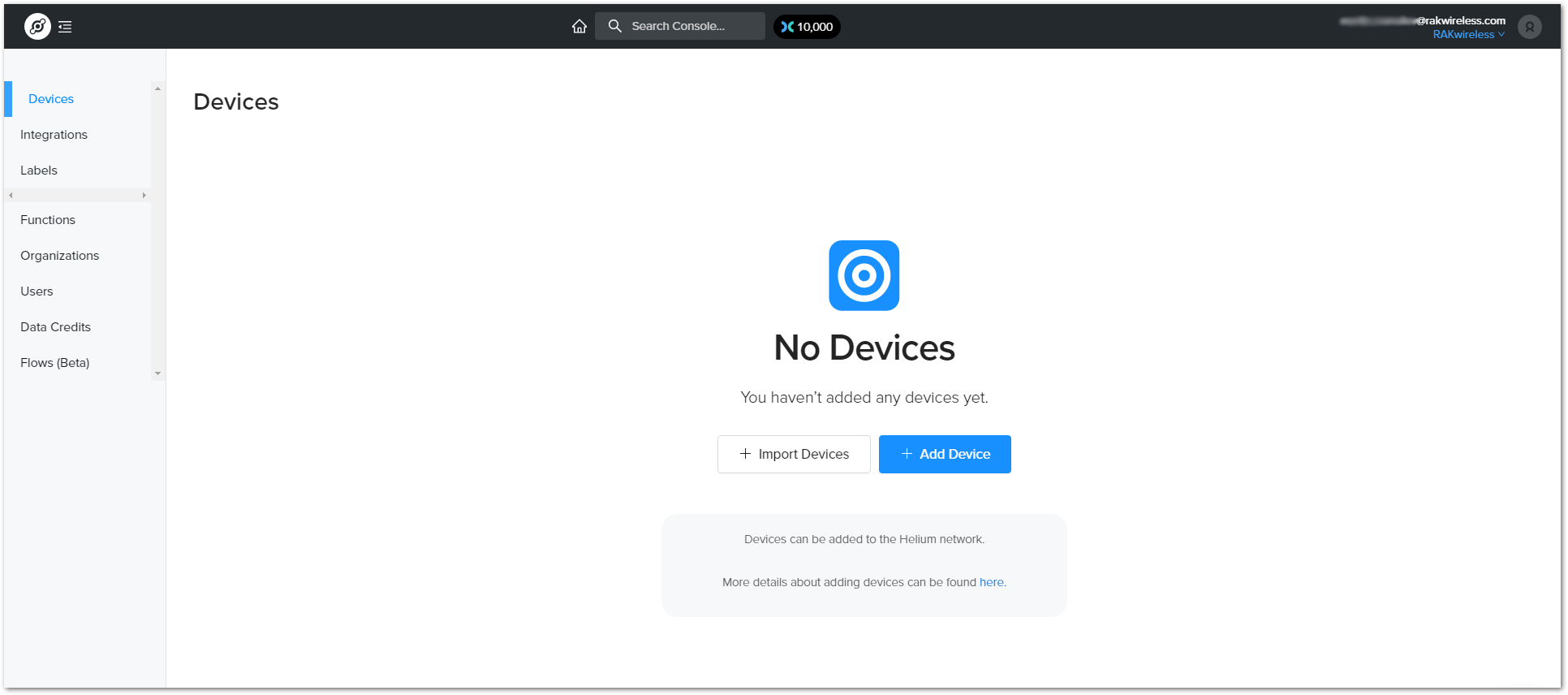 Go to the Devices section in the function tree. There will be no registered devices if this is your first time doing this. To add a device, click the + Add Device button and get started.