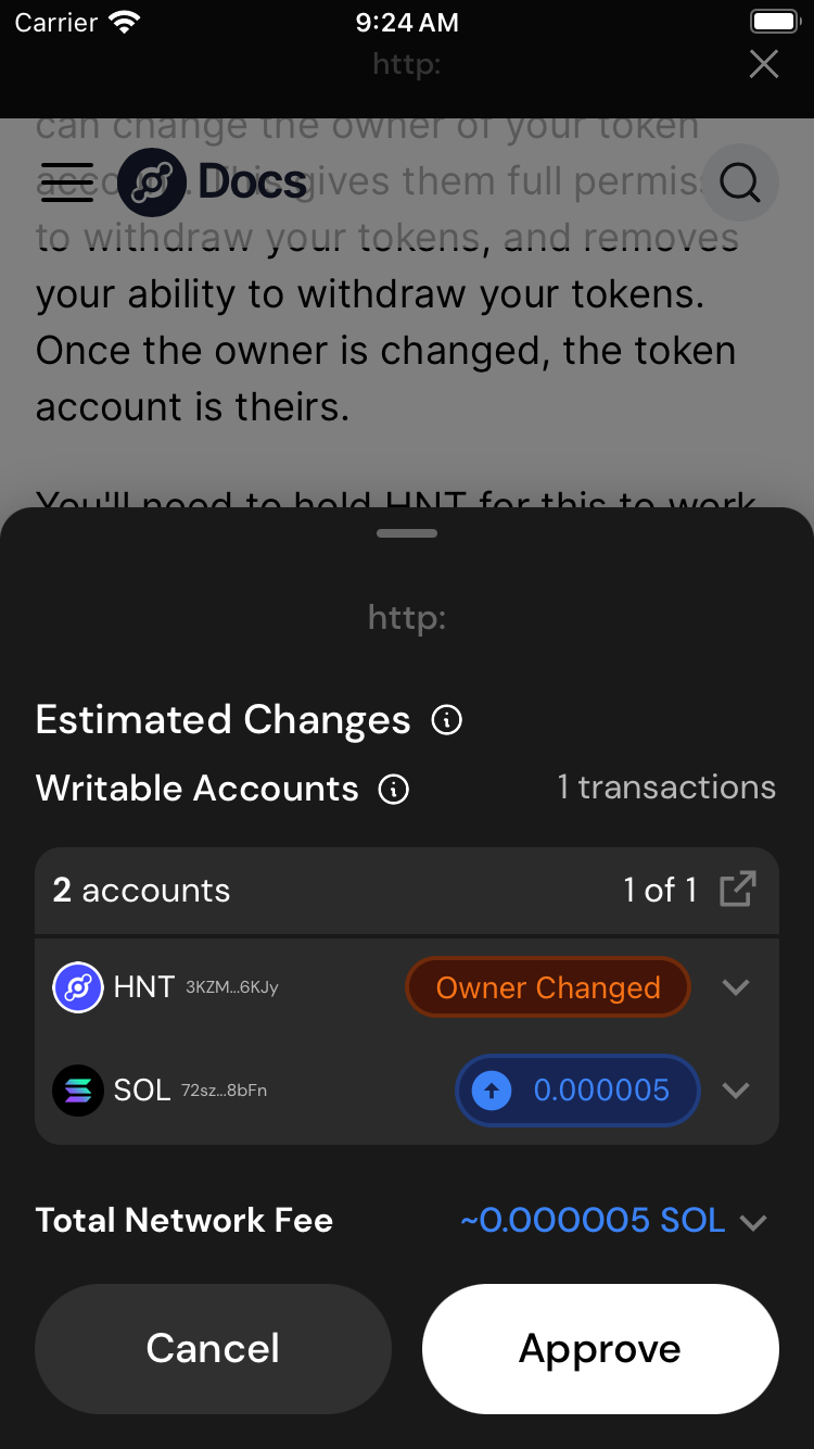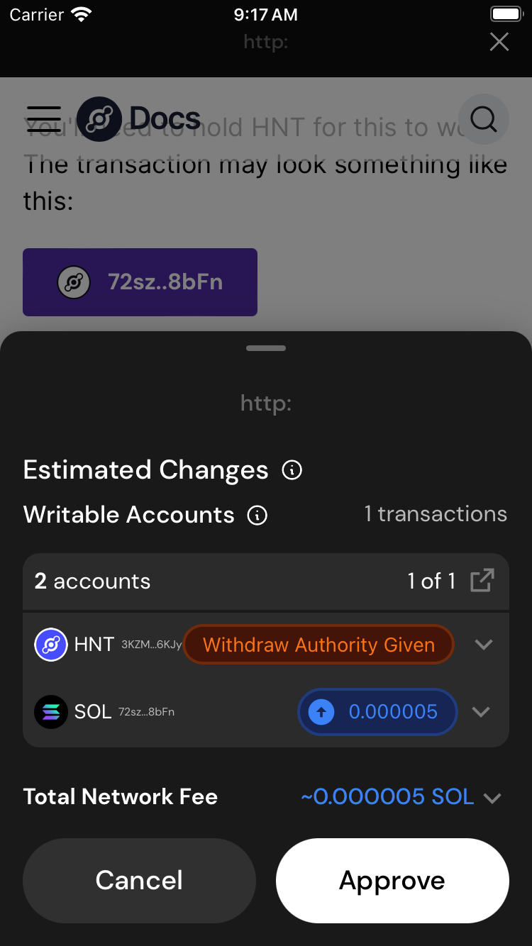 Generally, these transactions will come under the guise of another function. An attacker may claim this transaction will give you free tokens, mint an NFT, or even repair your hotspot. The attacker is lying. If anyone tells you to ignore the transaction preview warnings, they are suspicious.