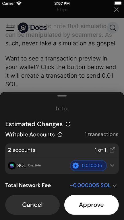 Want to see a transaction preview in your wallet? Click the button below and it will create a transaction to send 0.01 SOL.